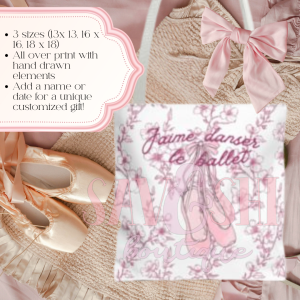 Price range: $28.00 through $40.00This Tote Bag features a delicate pink cherry blossom background with pink hand-drawn ballet slippers pointe shoes and the word ballet, customized with a name. Perfect for ballet enthusiasts and dancers, this tote bag gives off a feminine and elegant vibe. It is ideal for carrying dance shoes, costumes, and essentials to dance classes, recitals,…